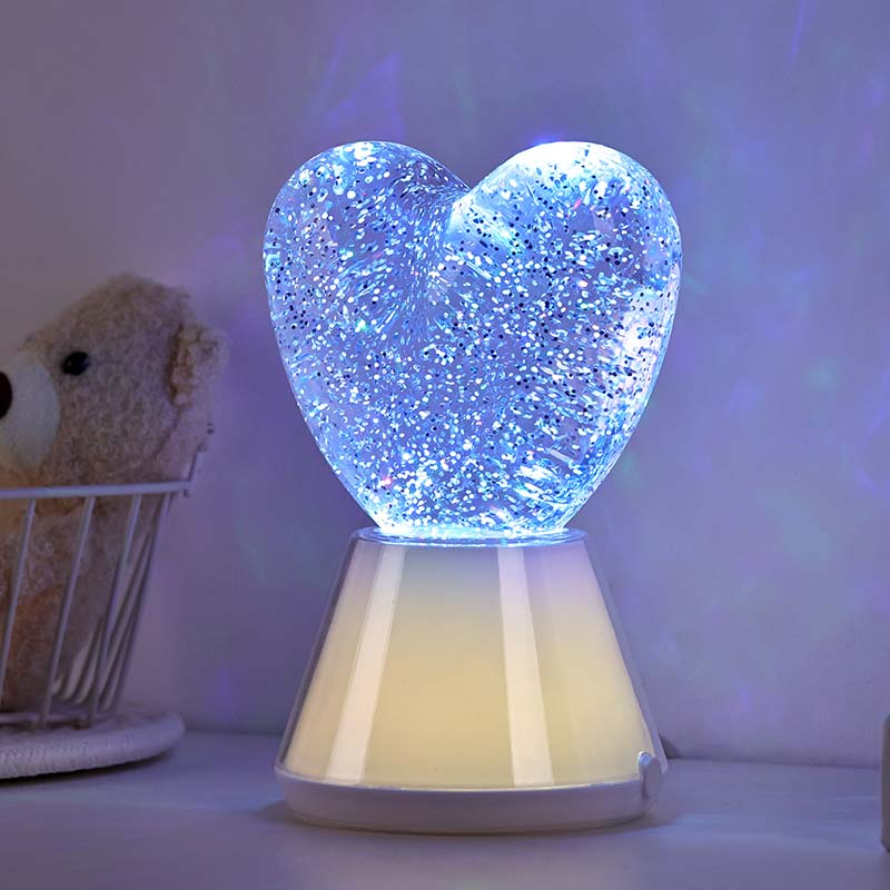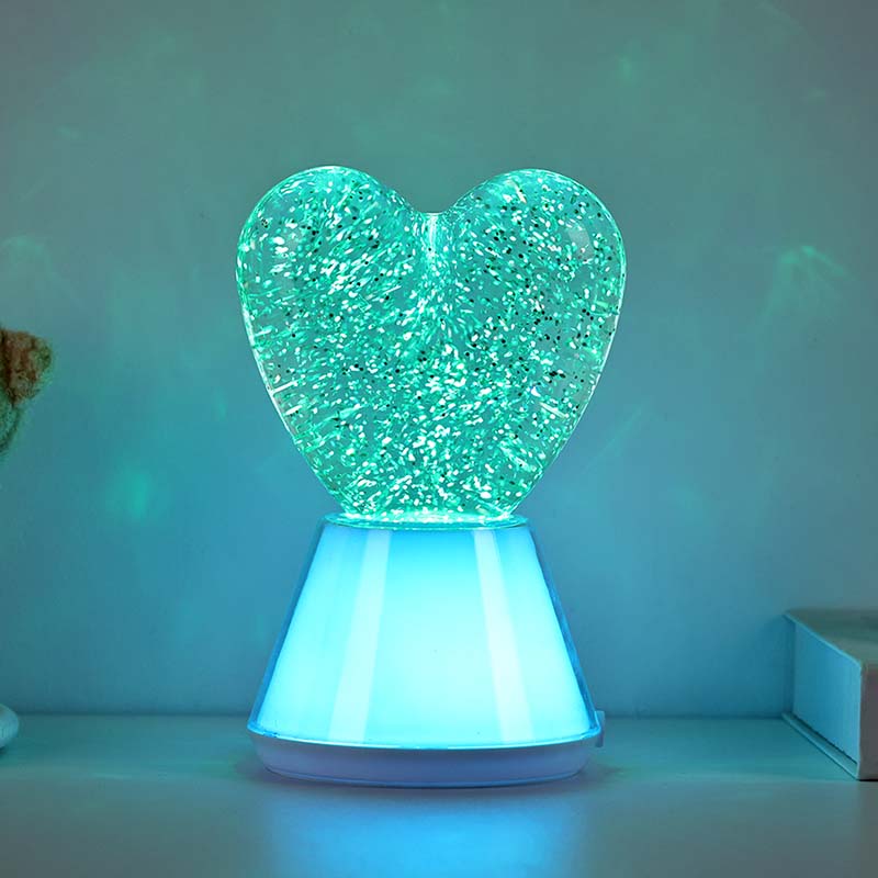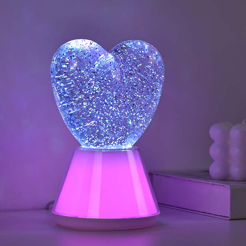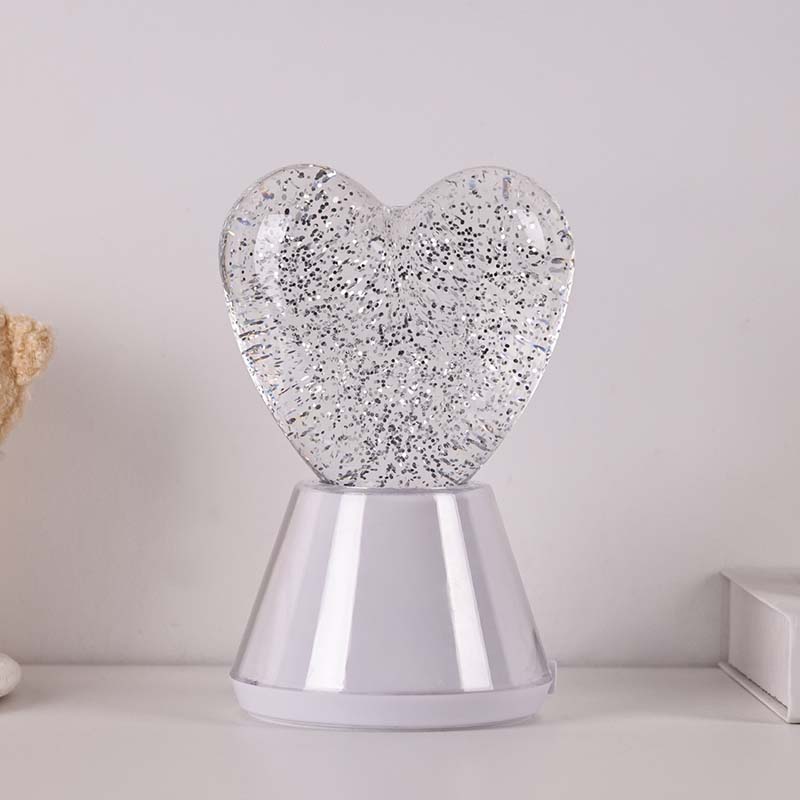 हृदयाच्या सावलीसह रंग बदलणारा लिक्विड ग्लिटर नाईट लाइट. रहस्यमय द्रवाने भरलेला एक उत्कृष्ट काचेचा बॉल आहे, ज्यामध्ये चमकणारे सेक्विन तरंगतात. चमत्कारिकरित्या, रंग बदलणारा लिक्विड ग्लिटर नाईट लाइट विथ हार्ट शेड जणू एखाद्या जादुई जगात नाचत आहे.