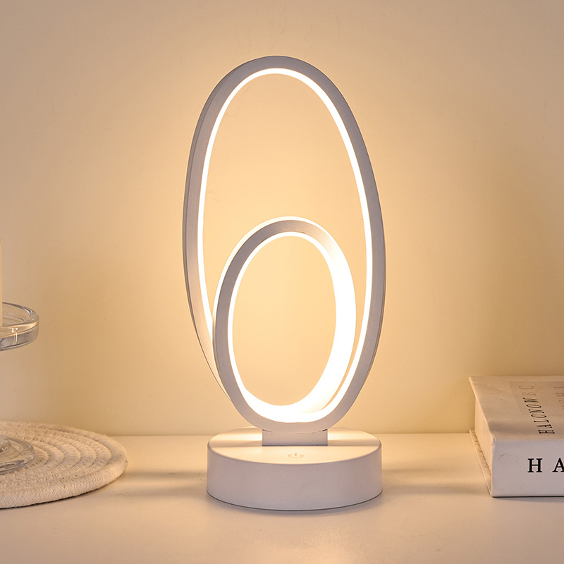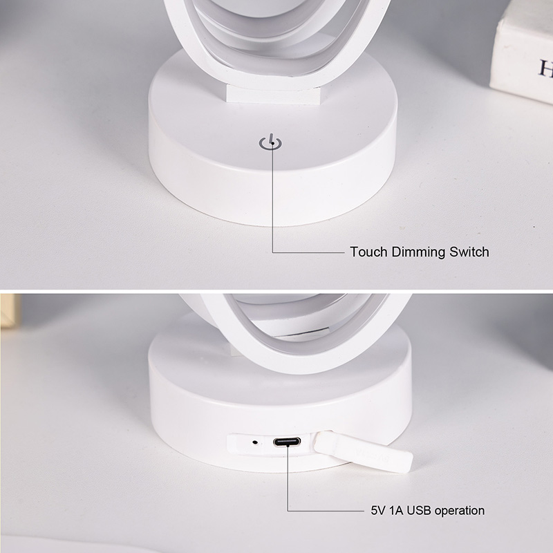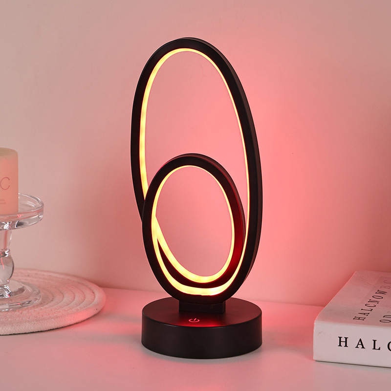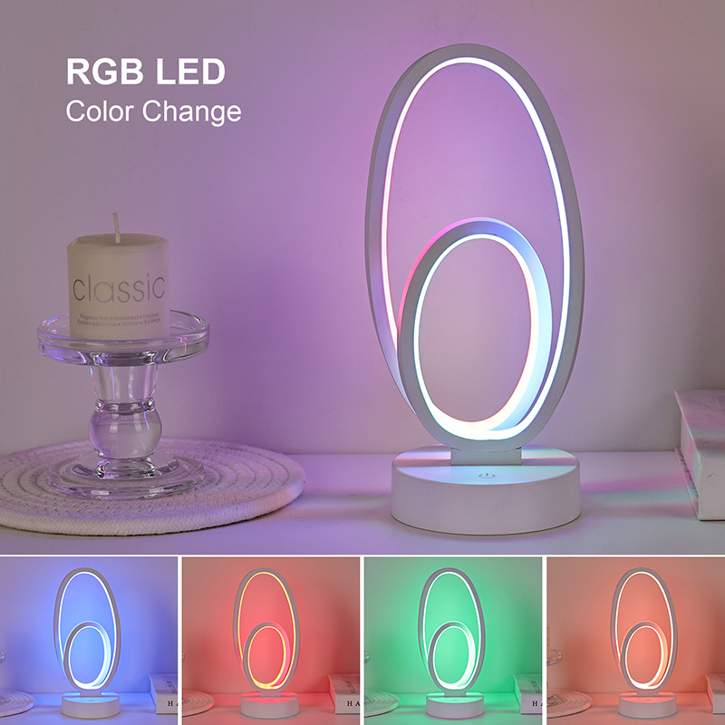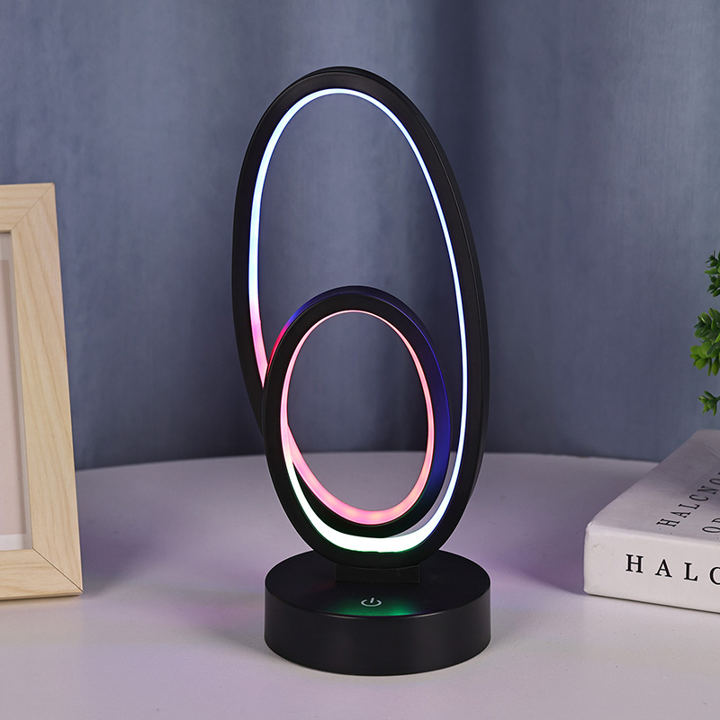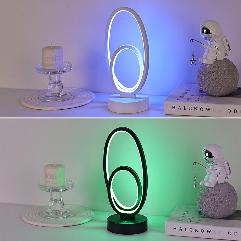 डबल सर्कुलर रिंग शेड आरजीबी डेस्क लॅम्प हा घरातील जागांसाठी एक कलात्मक उच्चारण आहे, ज्यामध्ये स्थिर आणि ऊर्जा-कार्यक्षम कामगिरीसाठी डीसी सुरक्षित कमी-व्होल्टेज वीज पुरवठा आहे, सुरक्षित वापर सुनिश्चित करणे. लिव्हिंग रूम, मुलांच्या खोल्या, अभ्यासाचे क्षेत्र आणि शयनकक्ष अशा विविध परिस्थितींसाठी योग्य