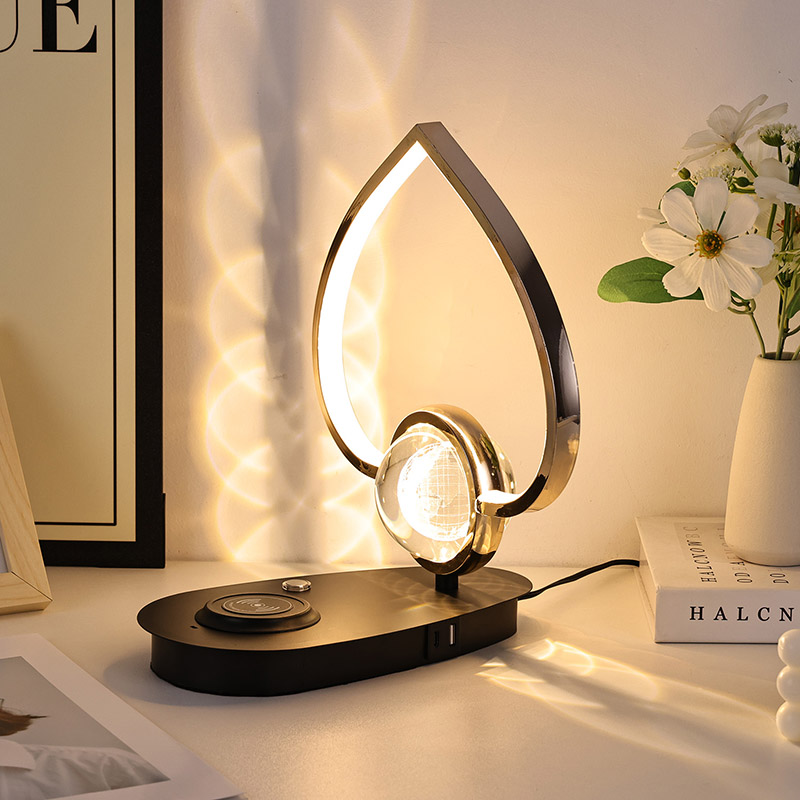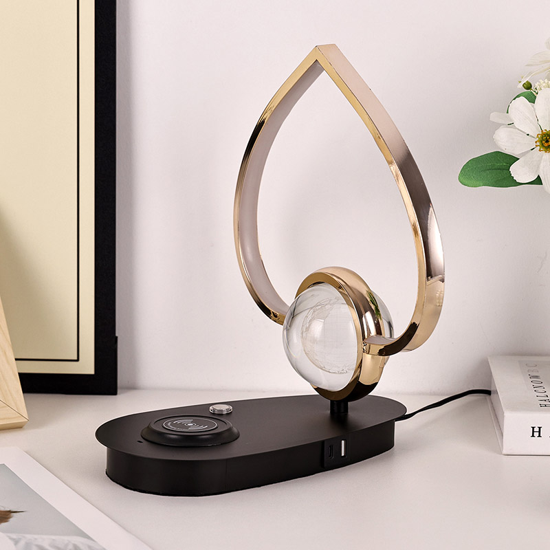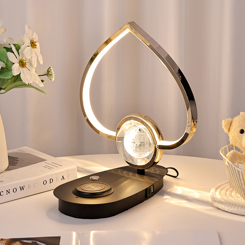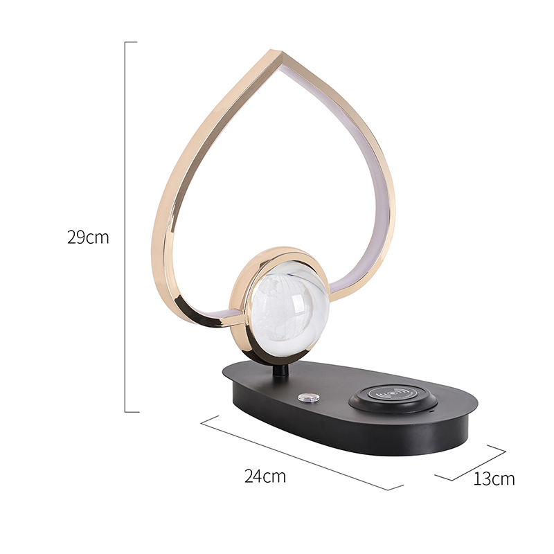 हार्ट शेड असलेला अर्थ वायरलेस चार्जर एलईडी डेस्क लॅम्प मेटल मेन स्ट्रक्चरने बनलेला आहे.