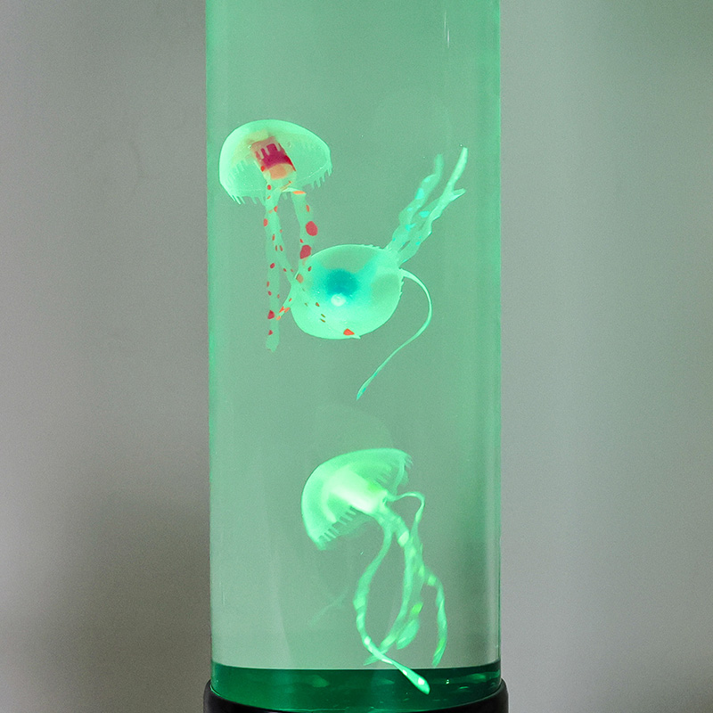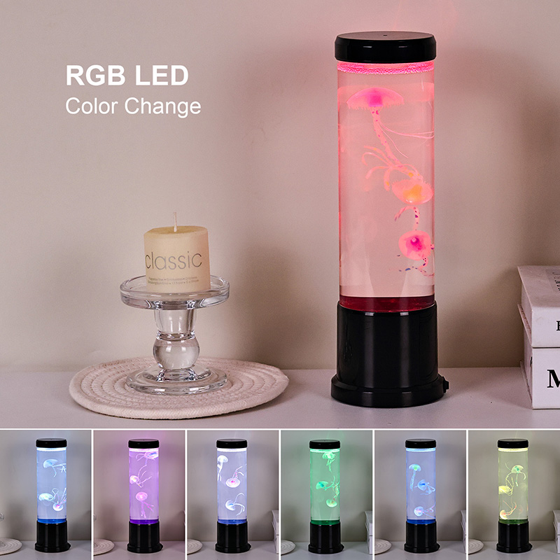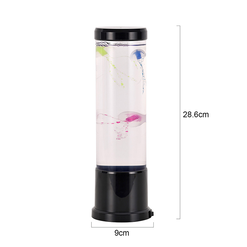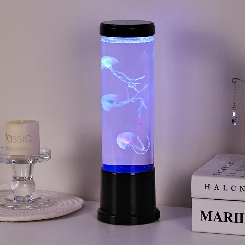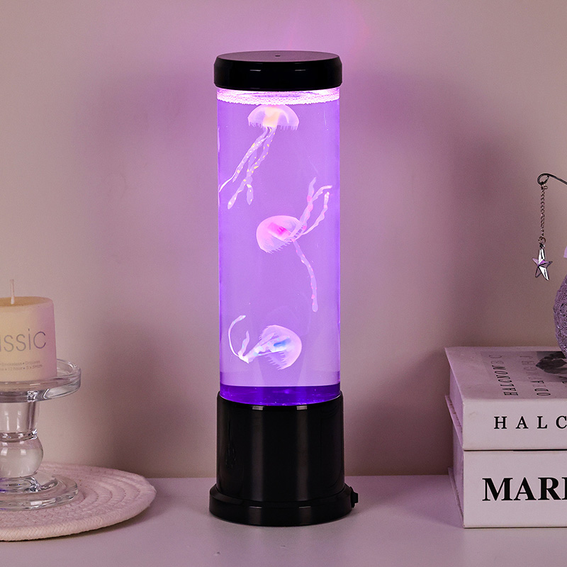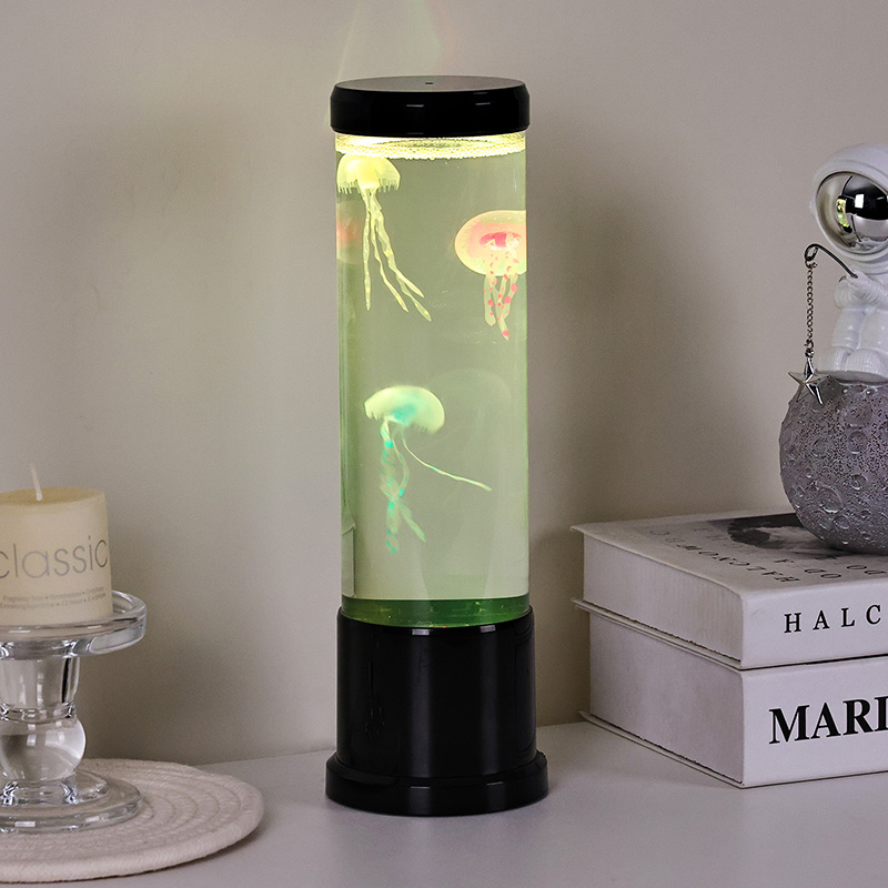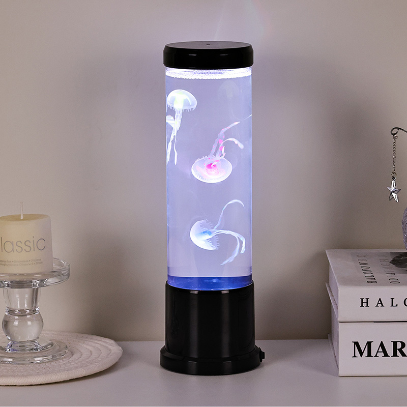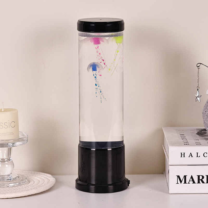 एलिगंट डिझाईन मीट्स नेचर-प्रेरित उच्च आकाराच्या एलईडी जेलीफिश दिव्यामध्ये उच्च-गुणवत्तेच्या, पारदर्शक ऍक्रेलिकपासून तयार केलेला उंच, सडपातळ सिलिंडर आहे जो आतल्या सुंदर जेलीफिशला क्रिस्टल-स्पष्ट दृश्यमानता देतो. मऊ निळ्या द्रव माध्यमात आच्छादित, तीन सजीव जेलीफिश हळुवारपणे तरंगतात आणि नाडीत असतात, त्यांचे अर्धपारदर्शक शरीर डायनॅमिक, बहु-रंगीत एलईडी दिव्यांनी प्रकाशित होते. कोमल चमक सुखदायक रंगांच्या स्पेक्ट्रममधून बदलते — खोल समुद्रातील ब्लूज आणि जांभळ्यापासून मऊ गुलाबी आणि हिरव्या भाज्यांपर्यंत — वास्तविक खोल समुद्राच्या वातावरणात आढळणाऱ्या बायोल्युमिनेसन्सची नक्कल करते. दिव्याचा वरचा भाग आणि पाया चकचकीत काळ्या प्लॅस्टिकमध्ये तयार केला आहे, ज्यामुळे त्याला आधुनिक, मिनिमलिस्ट लुक मिळतो जो कोणत्याही सजावट शैलीला पूरक असतो.