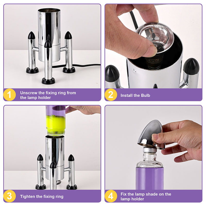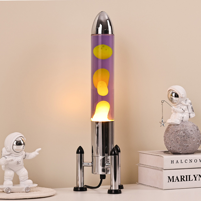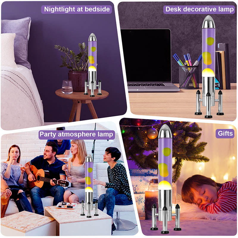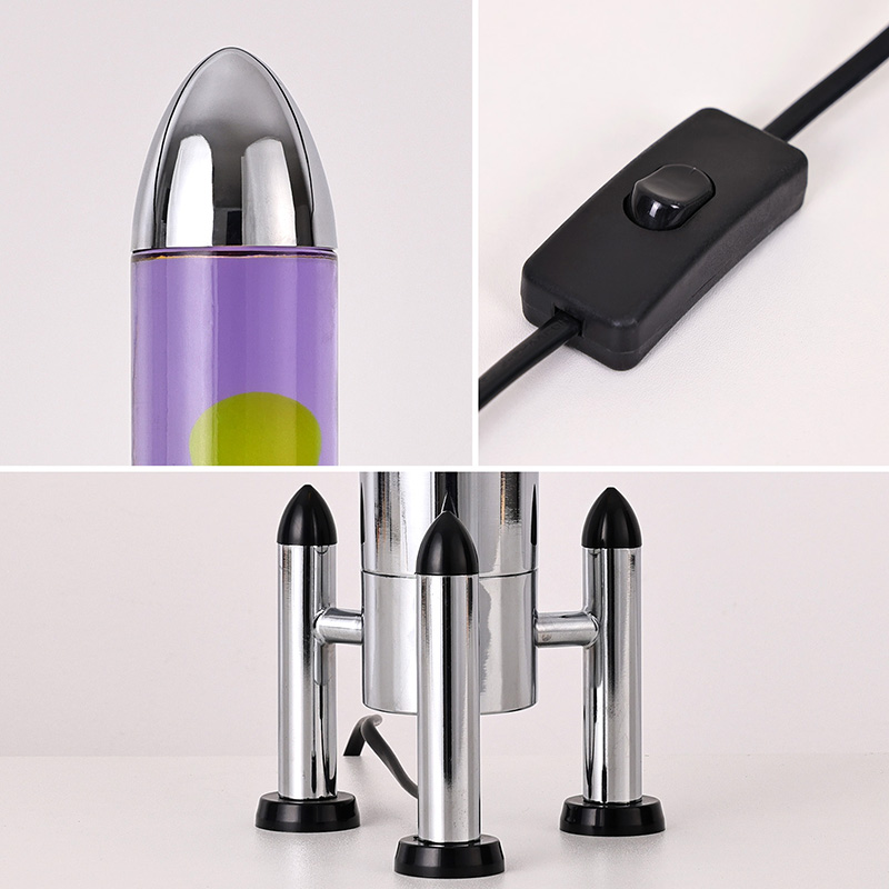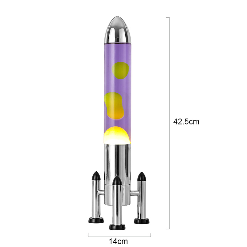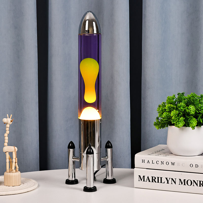 24Vरॉकेट शेडसह मोठ्या LED लावा दिव्यामध्ये क्लासिक रॉकेट आकाराचे डिझाइन आहे, ज्यामध्ये चांदीच्या धातूच्या कवचाचा एक पारदर्शक काचेच्या बाटलीच्या शरीरासह जोडलेला आहे, साधा पण स्टाइलिश. आतल्या जांभळ्या द्रवात पिवळा तरंगतो