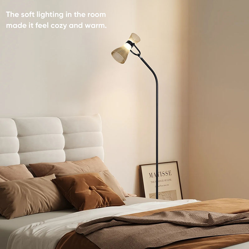 गुळगुळीत आणि नैसर्गिक रेषा, एक उदात्त आणि मोहक वातावरण प्रदर्शित करते. काचेची लॅम्पशेड दिव्याला पारदर्शक आणि शुद्ध पोत तर देतेच, पण प्रकाश प्रभावीपणे पसरवते, प्रकाश अधिक मऊ आणि एकसमान बनवते. दिवाणखान्यात, बेडरूममध्ये किंवा अभ्यासात ठेवलेले असो, काचेच्या सावलीसह आधुनिक एलईडी फ्लोअर दिवा उत्तम प्रकारे करू शकतो
