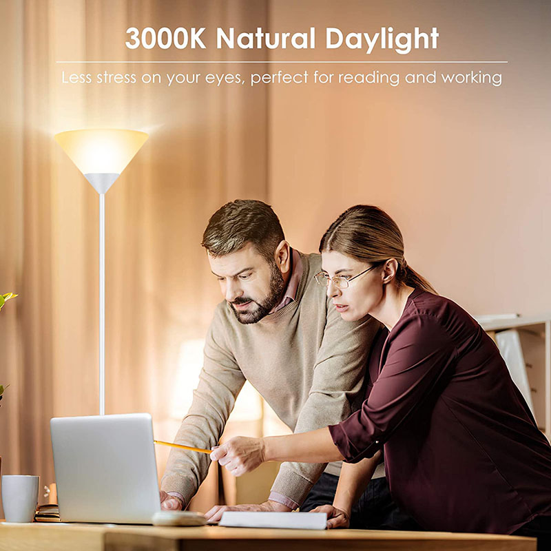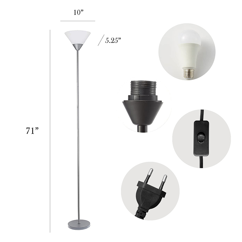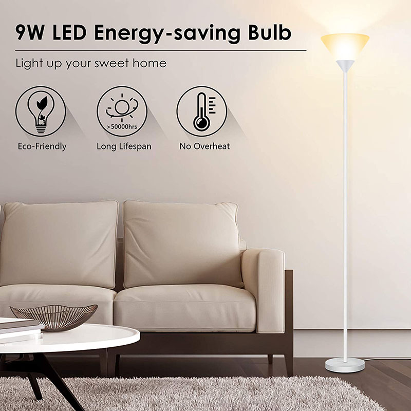 9W LED ऊर्जा बचत बल्बसह लॅम्प फ्लोअर कव्हर. चमकदार टाळण्यासाठी आणि तुमच्या डोळ्यांचे संरक्षण करण्यासाठी उत्पादनाचा प्रकाश बल्ब वरच्या दिशेने प्रकाशित होतो.