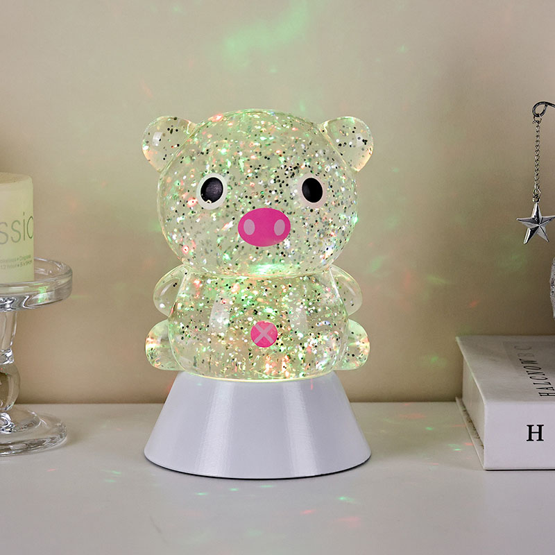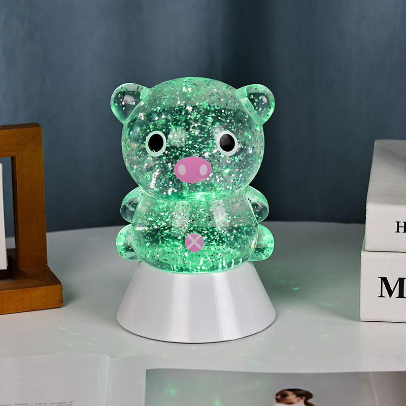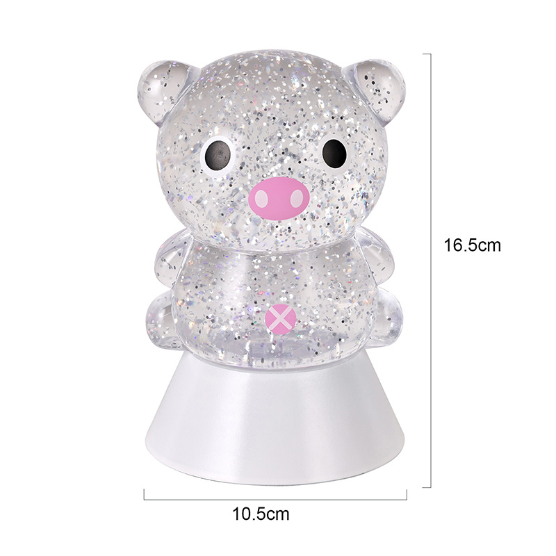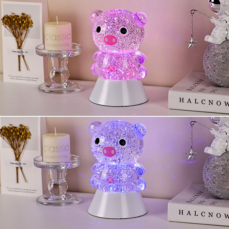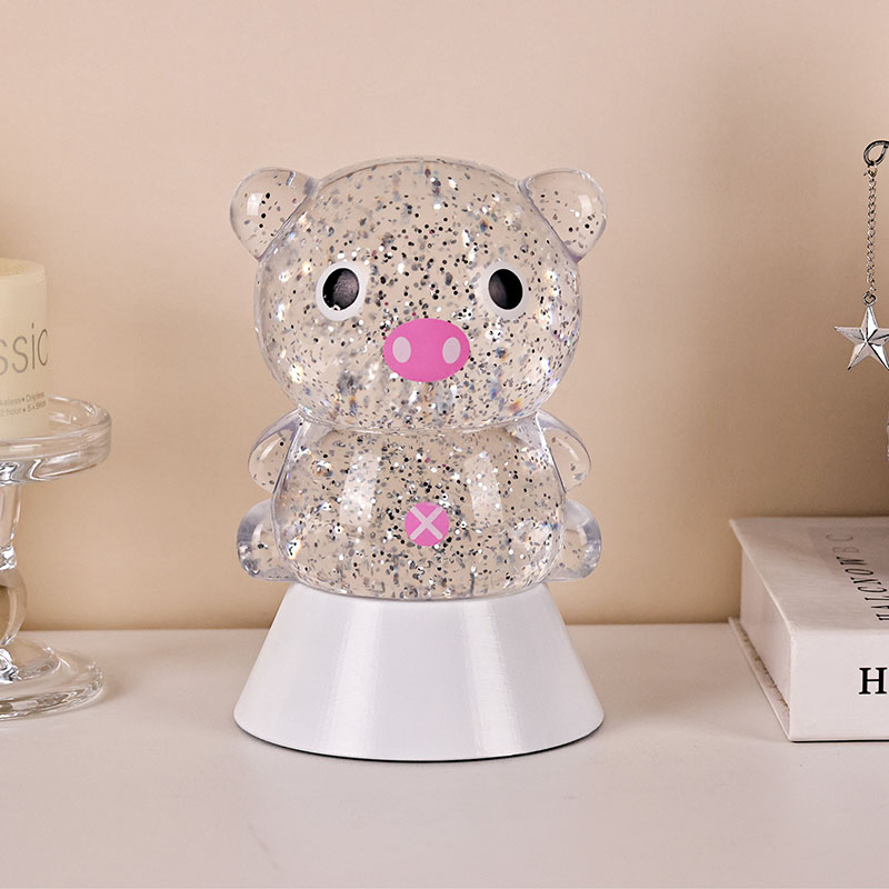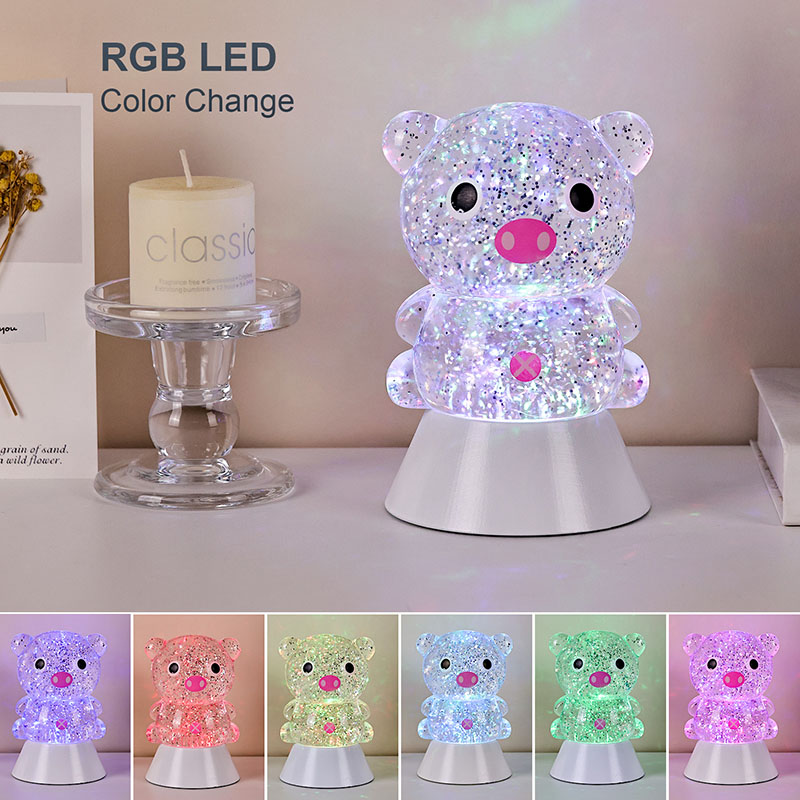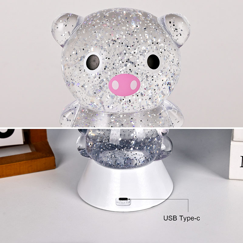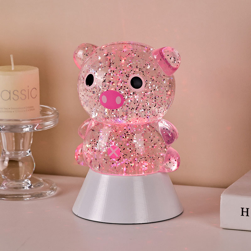 एकूणच डिझाईनमध्ये एक गोंडस आणि मोहक पिग्गी प्रतिमा आहे, तिचे गोलाकार आणि मोकळे आकृतिबंध मोठे डोळे, गुलाबी थुंकी आणि मोहक लहान कानांसह, प्रौढ आणि मुलांचे हृदय त्वरित पकडतात. पारदर्शक राळ कवच चमचमीत रंगीत सेक्विन आणि विशेष द्रवाने भरलेले असते, जे दिवे चालू केल्यावर हळूवारपणे द्रवाने वाहते, पिग्गीच्या शरीरात वाहणाऱ्या तारांकित नदीसारखा स्वप्नवत दृश्य प्रभाव निर्माण करते. हलके रंग आपोआप चक्रावून जातात, मऊ गुलाबी आणि स्वप्नाळू जांभळ्या वरून ताज्या निळ्या आणि हिरव्या रंगात बदलतात, सतत रंगांच्या इंद्रधनुष्यात बदलतात जे एक शांत पण जादुई वातावरण तयार करतात, जणू परीकथेचे जग प्रत्यक्षात आणतात.