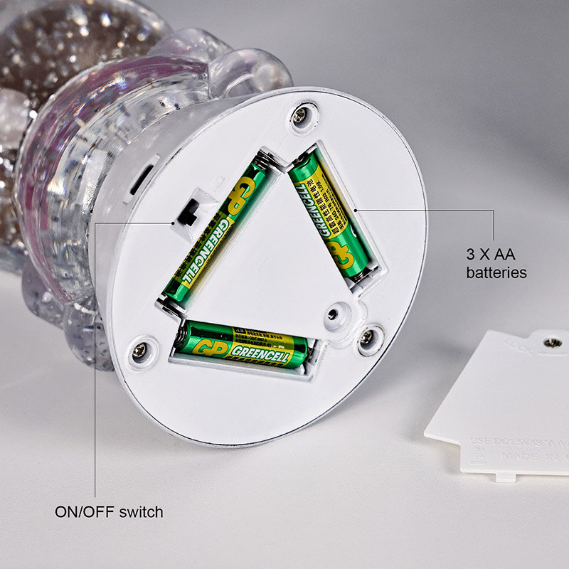पिग शेड आरजीबी ग्लिटर टेबल लॅम्प तळाशी एक साधे आणि मोहक पांढरे बेस डिझाइन वैशिष्ट्यीकृत करते, जे केवळ एकंदर सौंदर्यच वाढवत नाही तर टिपिंग टाळण्यासाठी स्थिरता देखील सुधारते. बेसमध्ये अंतर्गत बॅटरी कंपार्टमेंट समाविष्ट आहे जेथे वापरकर्ते सहजपणे तीन AAA बॅटरी स्थापित करू शकतात (समाविष्ट नाही). प्लग इन करण्याची आवश्यकता नसताना, ते पोर्टेबिलिटी देते आणि बेड, डेस्क, घरकुल किंवा प्रवासादरम्यान बसवण्यासाठी आदर्श आहे. स्विच डिझाइन वापरकर्त्यासाठी अनुकूल आहे, साध्या स्पर्शाने सोपे चालू/बंद नियंत्रणास अनुमती देते, ते ऑपरेट करणे सुरक्षित आणि सरळ बनवते—विशेषत: लहान मुलांसाठी स्वतंत्रपणे वापरण्यासाठी योग्य.