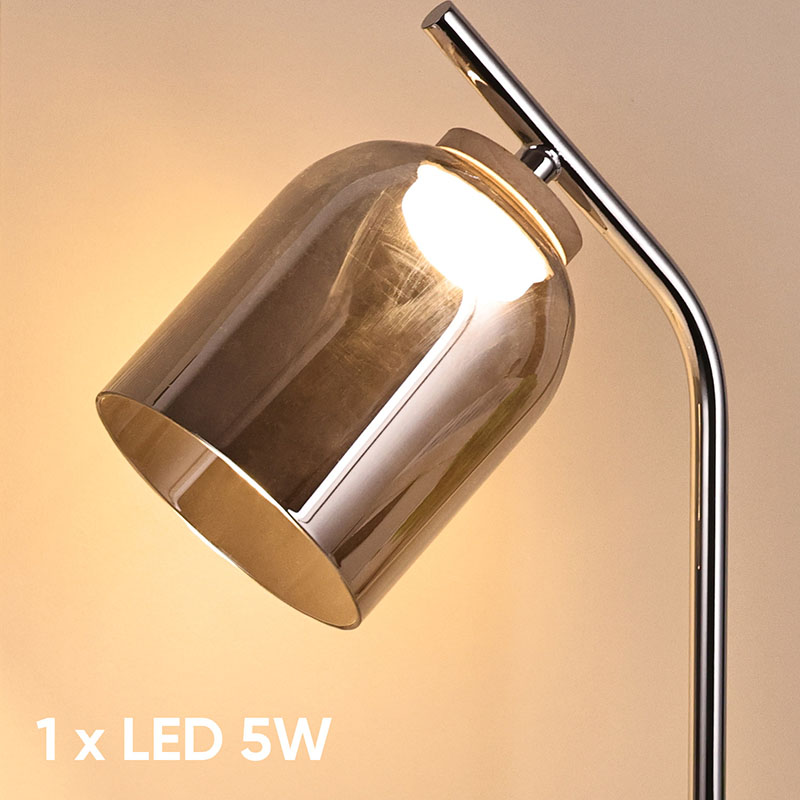 क्रोम बेस, स्मोकी (अंबर) काचेची सावलीनाविन्यपूर्ण डिझाइन, काचेचे साहित्य, उच्च श्रेणीचे आणि मोहक स्वरूप, अत्यंत सजावटीच्या डेस्क दिव्याची रचना शैली