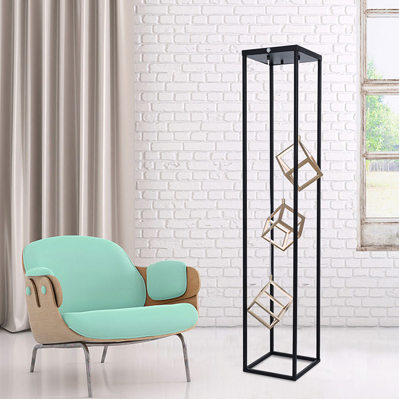 आधुनिक डिझाइन केलेले फ्लोअर दिवे, उत्पादनाचे सर्वात मोठे वैशिष्ट्य म्हणजे आयताकृती फ्रेमचा आकार, ज्याच्या आत 3 चौरस एलईडी झुंबर आहेत. हॉलमध्ये सजावट म्हणून एकंदर डिझाइनचा वापर केला जाऊ शकतो आणि प्रकाशाची तीव्रता नियंत्रित करण्यासाठी शीर्षस्थानी एक बटण आहे