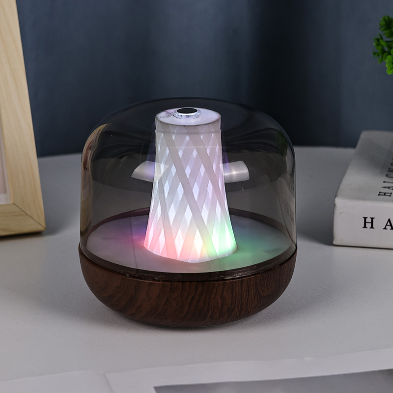 टॉवरच्या आत प्रकाश नाचत असताना, पारदर्शक प्लास्टिकचे आवरण हळूवारपणे चमक पसरवते, एक अस्पष्ट, इथरियल वातावरण तयार करते. एका अंधारलेल्या खोलीत, संपूर्ण रचना एक तरंगता "प्रकाशाचा बुरुज" - शांतता आणि रहस्य पसरवणारी, शांत चिंतनासाठी आमंत्रित करते.
