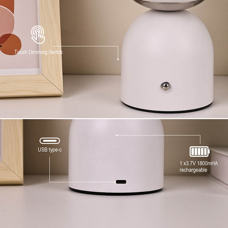 काळा, पांढराबॅटरी रिचार्जेबल असलेल्या लहान टेबल लॅम्पची रचना साधी आहे, जंगम आहे आणि सजावटीसाठी वापरली जाऊ शकते. डोके पीई कव्हरने बनलेले आहे आणि कव्हरमधून प्रकाश चमकतो. उबदार रंगाचा प्रकाश खूप मऊ आहे. संपूर्ण गोलाकार डिझाइन, तळाशी अर्ध-अखंड धातूची रचना आहे ज्यामध्ये कमानीच्या आकाराचे गोलार्ध आकार आहे, प्रकाश समायोजित करण्यासाठी टच स्विचसह एम्बेड केलेले आहे. बॅटरीसह लहान टेबल दिवा रिचार्ज करण्यायोग्य बॅटरीद्वारे समर्थित आहे, जी USB प्रकार सी केबलने चार्ज केली जाऊ शकते.