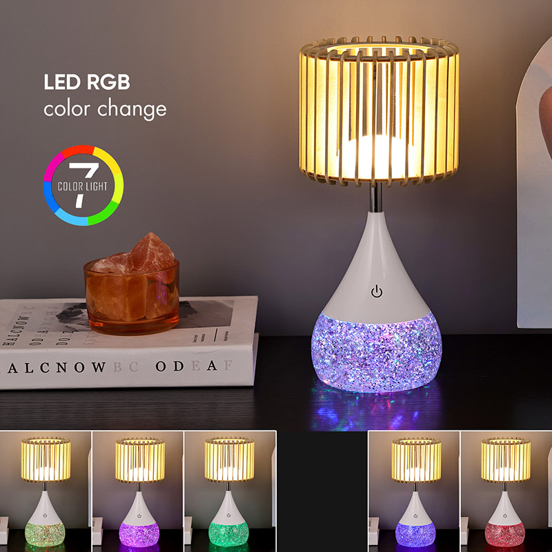 डिझाइन:** अद्वितीय लाकडी स्लॅट लॅम्पशेड, RGB रंग बदलणारा बेस