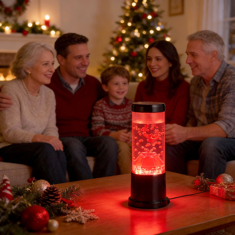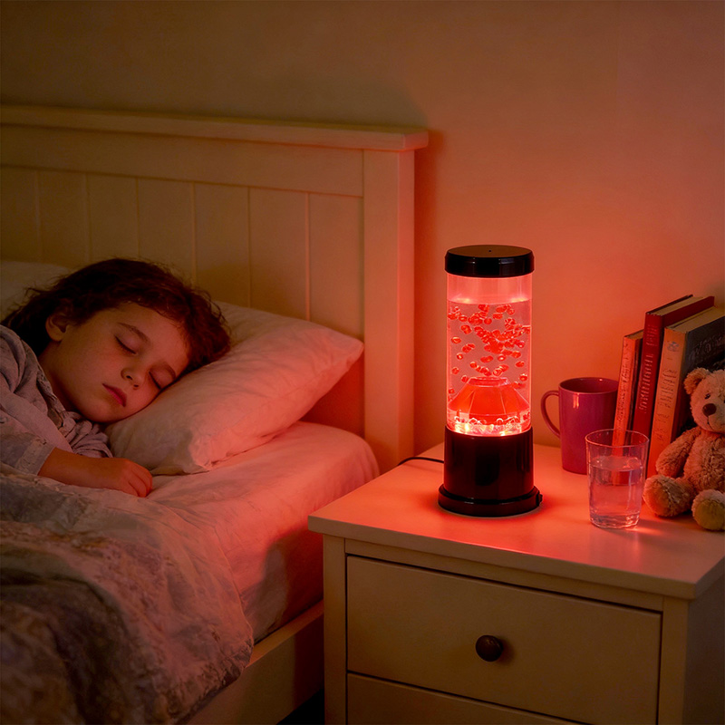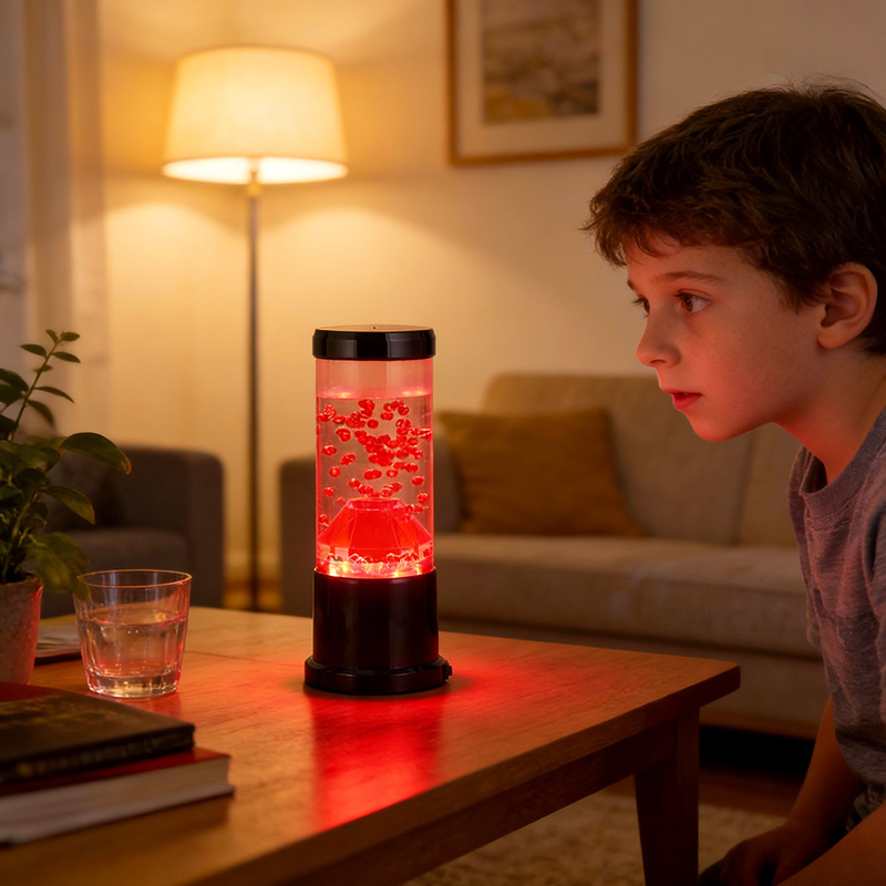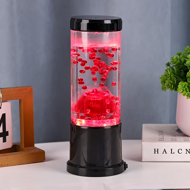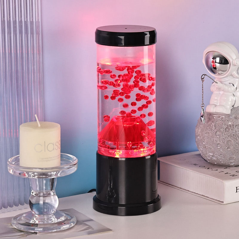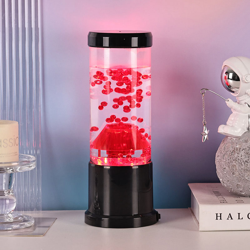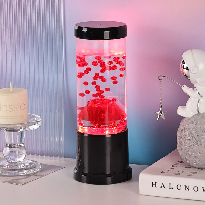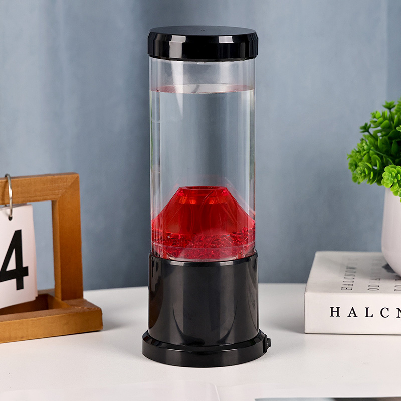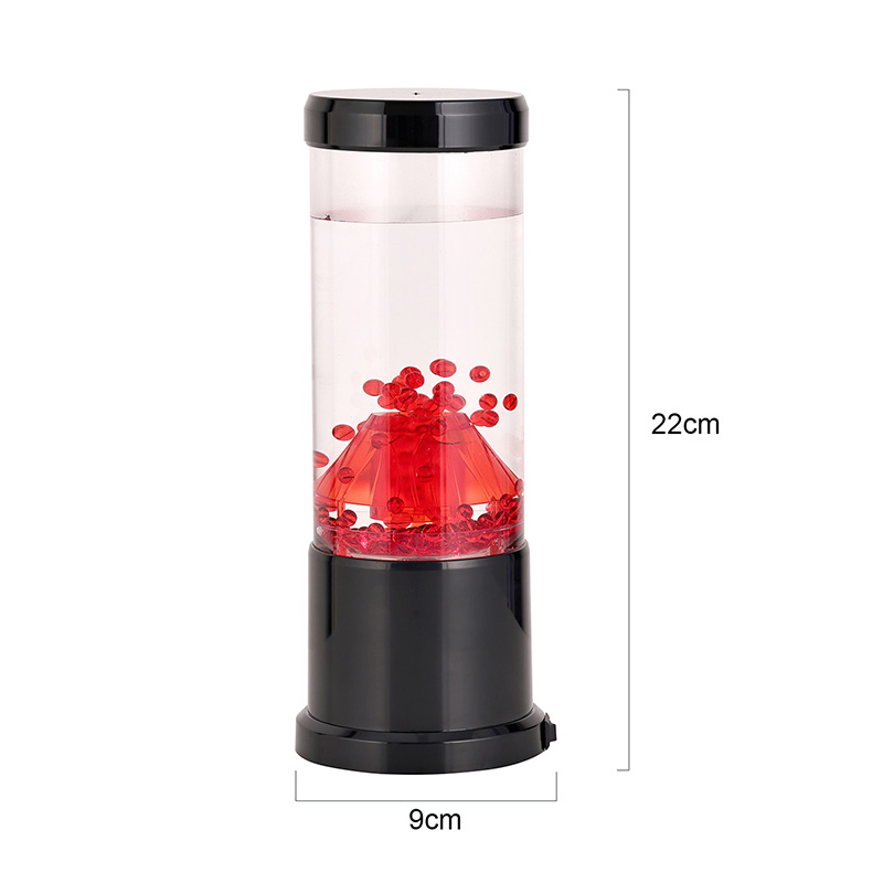 रात्रीच्या प्रकाशाचा मध्य भाग हा एक पारदर्शक स्तंभ आहे जो ज्वालामुखीच्या विवरासारखा दिसतो. या स्तंभाच्या आत, तुम्हाला लाल गोलाकारांचे एक दोलायमान प्रदर्शन दिसेल, जे पृथ्वीच्या कवचात वाहणाऱ्या वितळलेल्या लावाची आठवण करून देईल. हे गोलाकार एका स्पष्ट द्रवामध्ये सुंदरपणे तरंगतात, एक गतिमान आणि सतत बदलणारे दृश्य परिणाम तयार करतात. जसजसा प्रकाश पडतो, तसतसे ते उबदार आणि आमंत्रण देणारी चमक दाखवते, कोणत्याही खोलीत आरामदायक वातावरण तयार करण्यासाठी योग्य आहे.