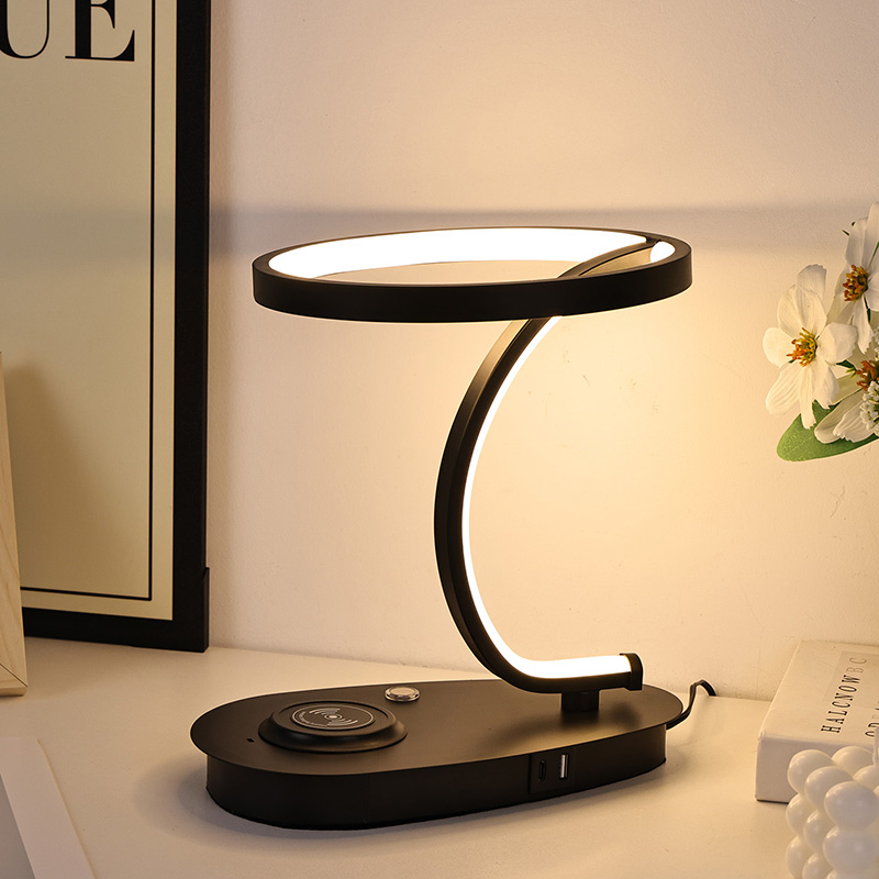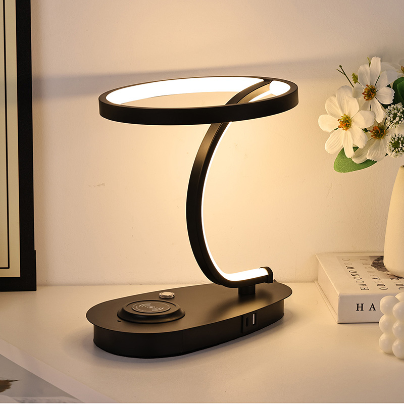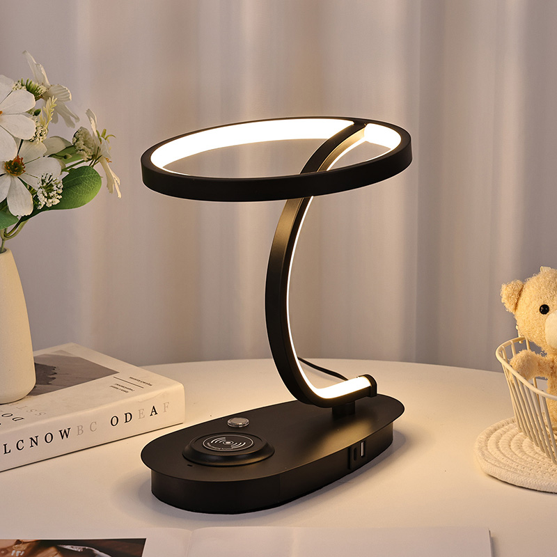 रिंग शेडसह वायरलेस चार्जर एलईडी डेस्क लॅम्प मेटल मेन स्ट्रक्चरने बनलेला आहे.
